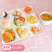 岩下の新生姜をさまざまに使ったオードブル7品、ライス、スイーツを盛り合わせたプレートに、トマト仕立てのスープをセットで。