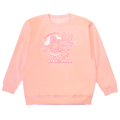 オンラインショップで購入もえのあずきさんとイワシカちゃんの描き下ろしコラボイラストを前面に大きくプリントした、ライトピンクのトレーナーです。裏起毛のスウェット生地はあたたかな着心地。もえのあずきさんこだわりのオーバーサイズ(4L)で、ゆったりと着られます。