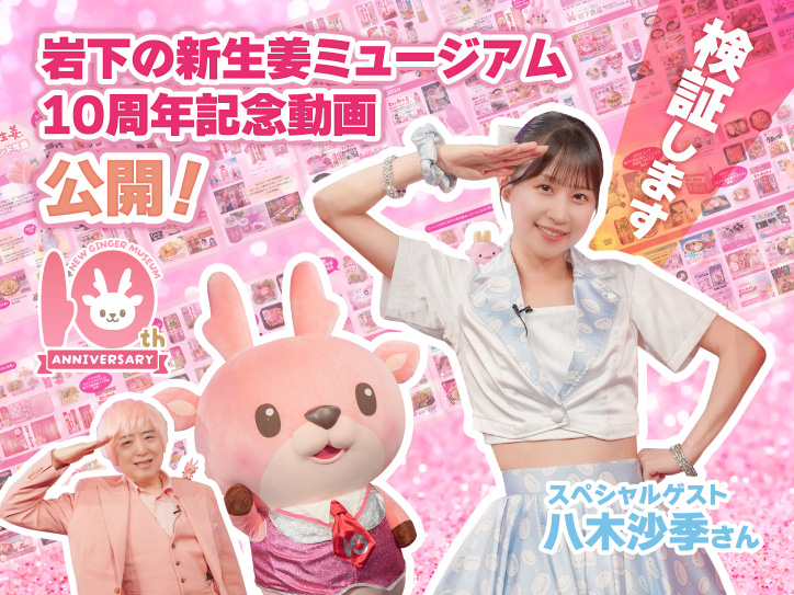10周年を記念して、「検証します!」動画が話題の八木沙季さんをスペシャルゲストにお迎えし、開館からの10年間を振り返り「検証する」動画を制作。岩下食品社長・ミュージアム館長の岩下和了、イワシカちゃんと一緒に、岩下の新生姜ミュージアムや岩下の新生姜の10年間の歩みをかけあし(約36分)で振り返ります。