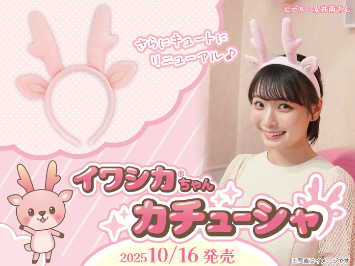 新しくなった「イワシカちゃんカチューシャ」は、ジンジャー神社のちょっとシャープな“狛鹿”スタイルから、商品パッケージも登場しているツノと耳の形が丸みをおびた公式キャラクターのスタイルに。より一層かわいらしいフォルムになりました。