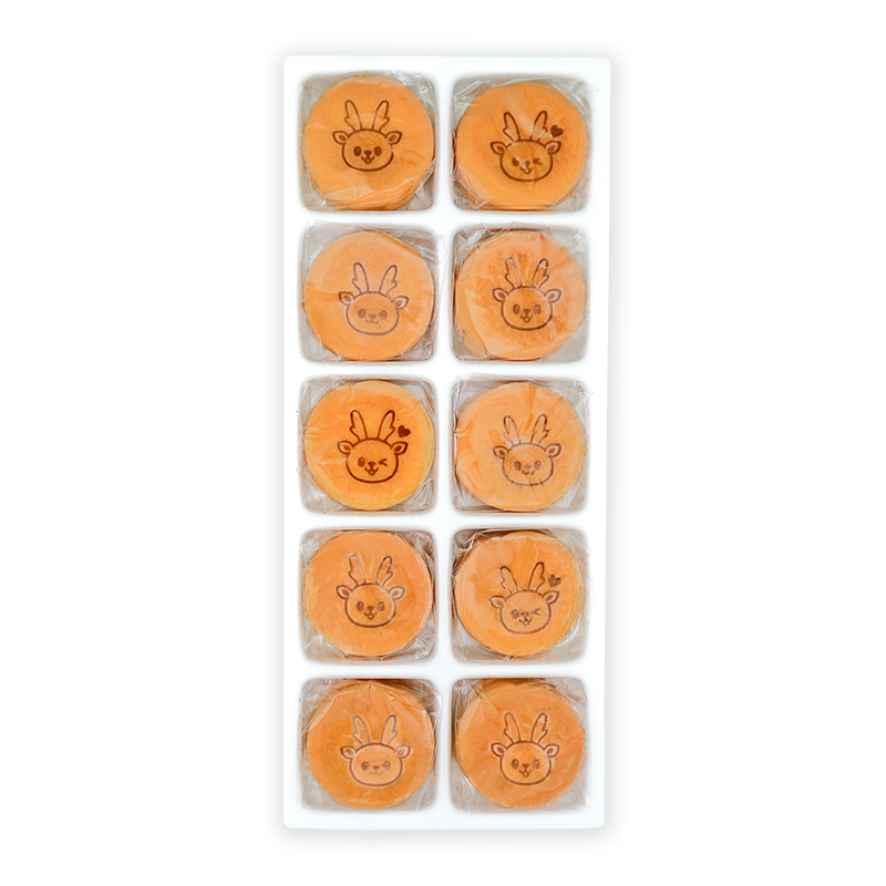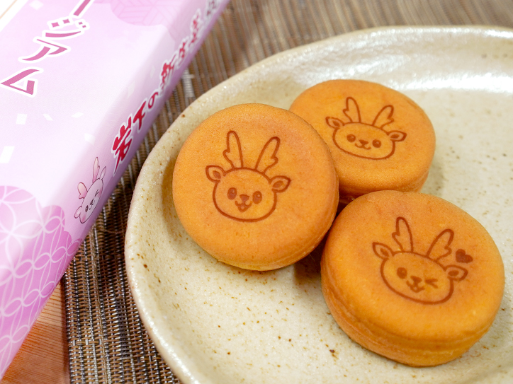岩下の新生姜パウダーで生姜の風味をほんのり効かせた白あんを、やさしい甘さのカステラ生地で包んで焼き上げたカステラ饅頭です。岩下の新生姜公式キャラクター「イワシカ®」ちゃんの3つの表情(阿/吽/ウインク)がかわいらしい焼き印入り。