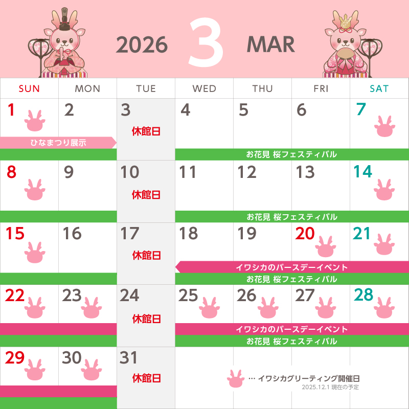 ●イワシカちゃんグリーティング…土日祝日に加え、3月23日(月)~27日(金)・30日(月)も開催します。(休館日を除く)