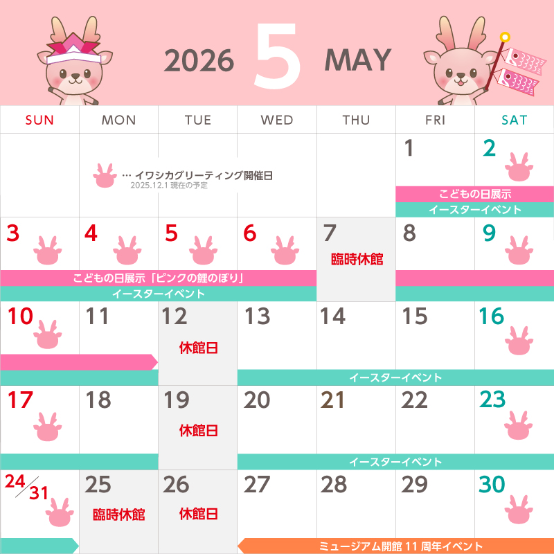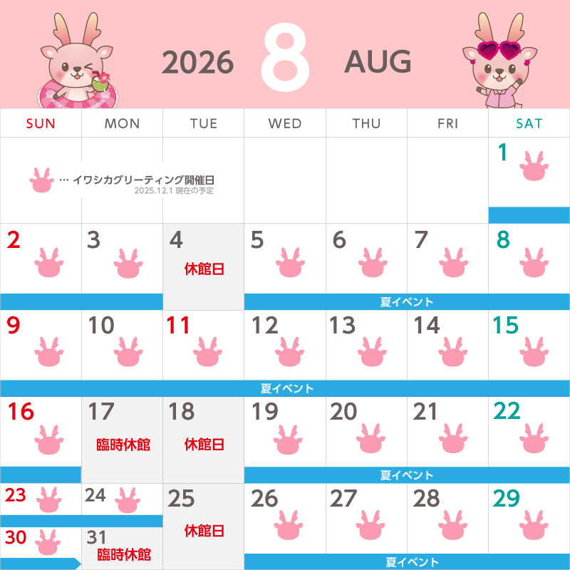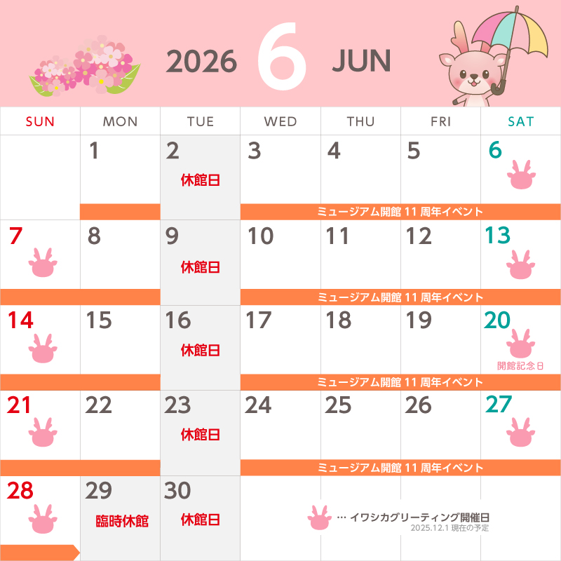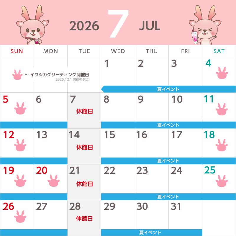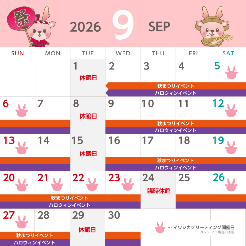 カレンダーのイワシカちゃんマークが開催日の目印です。各月のカレンダーをご確認ください。