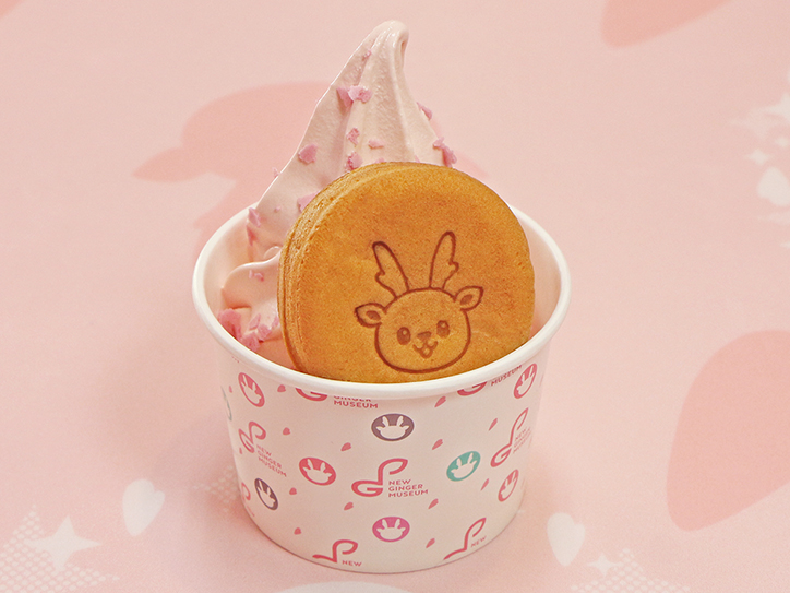 岩下の新生姜ソフトクリームに、イワシカちゃんの焼き印がかわいい白餡まんじゅうを添え、ピンクのフィアンティーヌをトッピングしました。ほんのり生姜風味でコクのあるソフトクリームに、カステラ生地の甘味と生姜風味の白餡が相性抜群です。